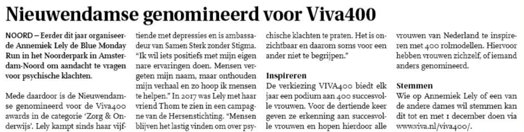 Het Noord-Amsterdams Nieuwsblad heeft aandacht besteed aan mijn nominatie voor de Viva400 awards. Je kunt het artikel lezen via deze link.